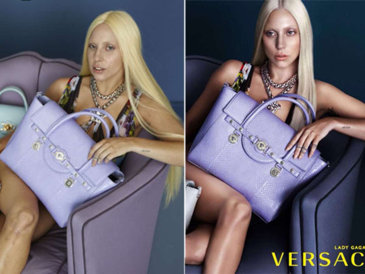 O uso do Photoshop no mundo da moda é generalizado e a última campanha que deixou isso evidente foi a da marca Versace, que teve a cantora Lady Gaga como estrela. Fotos da campanha para a primavera de 2014, antes dos retoques feitos com o programa, vazaram na internet e a diferença em relação às divulgadas pela grife são gritantes. As informações são do Bustle.