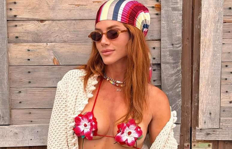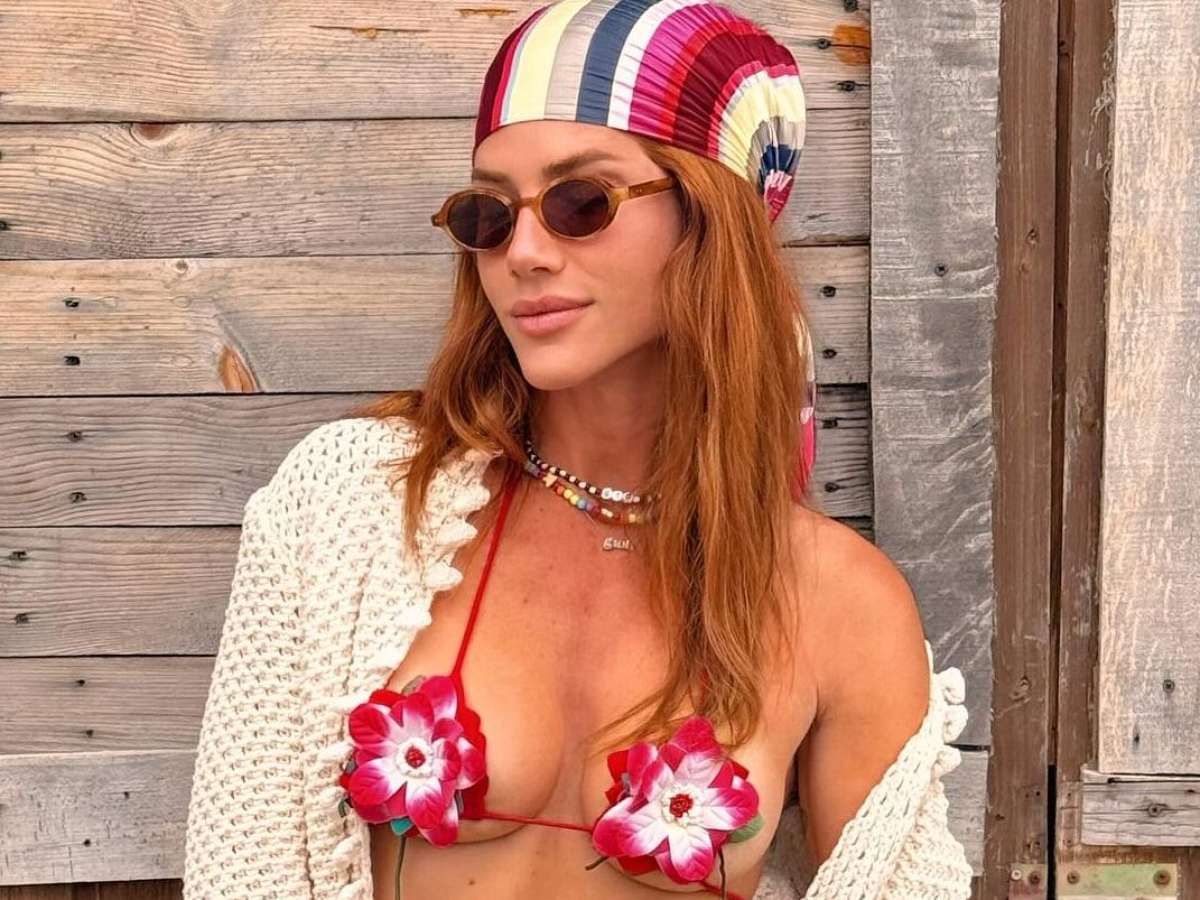 Lenço de cabeça, biquíni com flor aplicada, com estampa quadriculada ou de poá, touca, chapéu e bolsa de crochê, roupas marrons. Uau! Giovanna Ewbank levou uma mala cheia de tendências para sua viagem de lua de mel com Bruno Gagliasso na Itália.