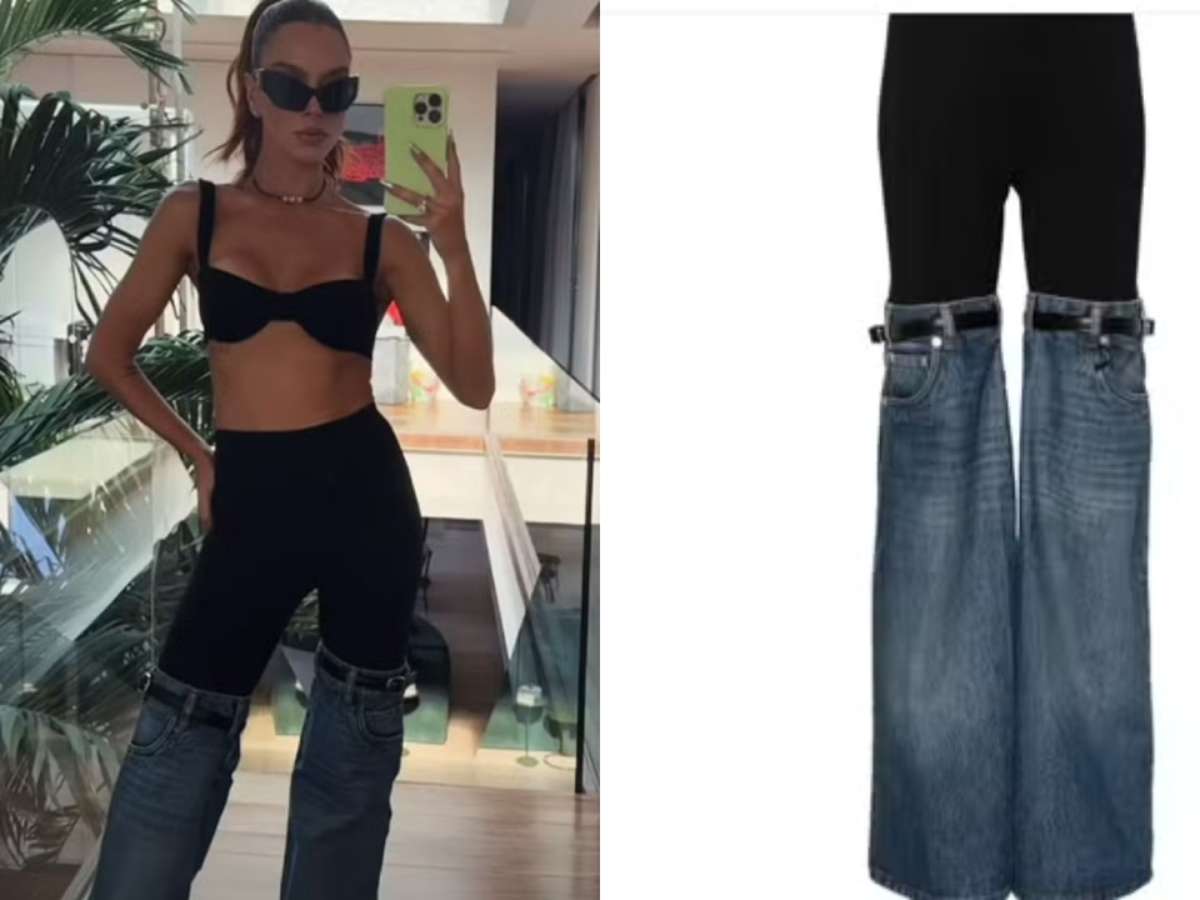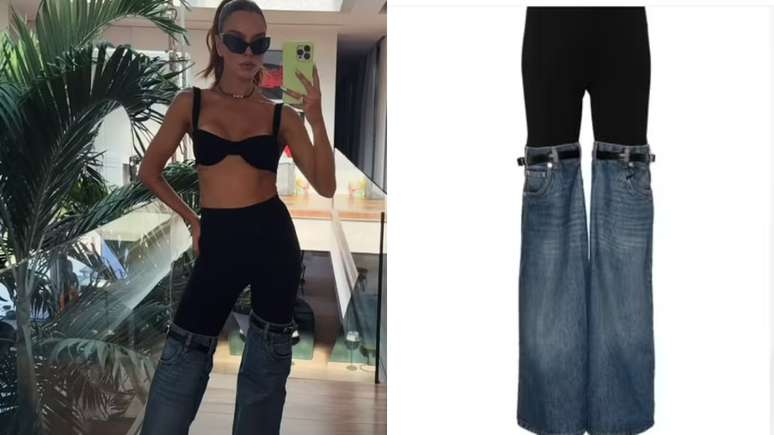 A calça, que combina elementos de legging preta com recortes em jeans na altura dos joelhos, foi projetada pela renomada grife Coperni. Avaliada em impressionantes R$ 7.690 em uma plataforma de e-commerce nacional, a peça apresenta ainda cintos pretos que descem até os pés, refletindo uma estética moderna e arrojada.