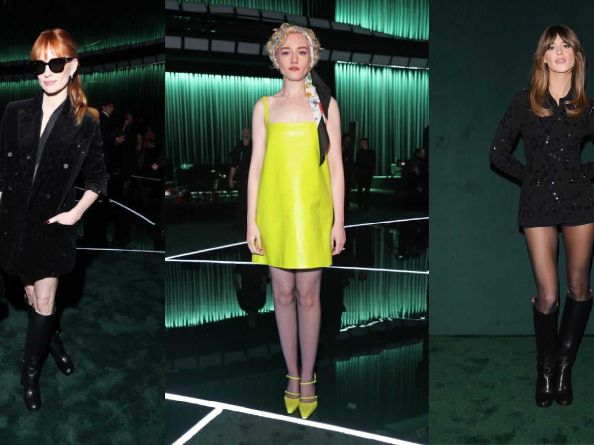 Jessica Chastain marcou presença na primeira fila do desfile com um look all black, mas o grande destaque da produção ficou por conta do modelo clássico da bolsa Gucci Bamboo, de 1947. A alça da peça é feita de bambu de verdade e o processo é extremamente lento e exclusivo. Os caules da planta são selecionados e passam por um processo de amaciar, talhar e manipular o bambu em um tipo de chama, até que se torne maleável, ficando de forma semicircular.