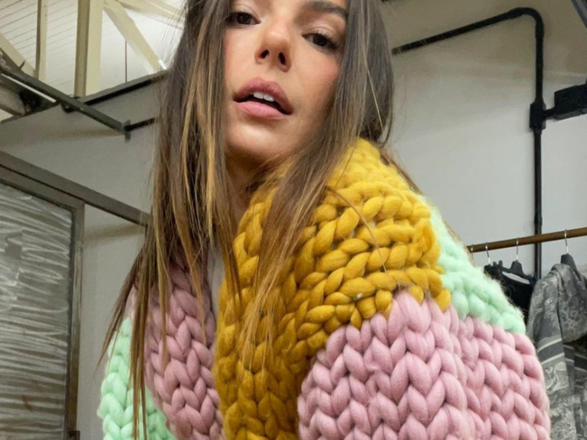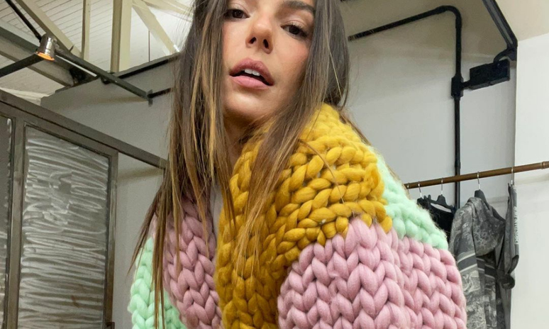 Isis Valverde chama atenção com jaqueta de tricô gigante
