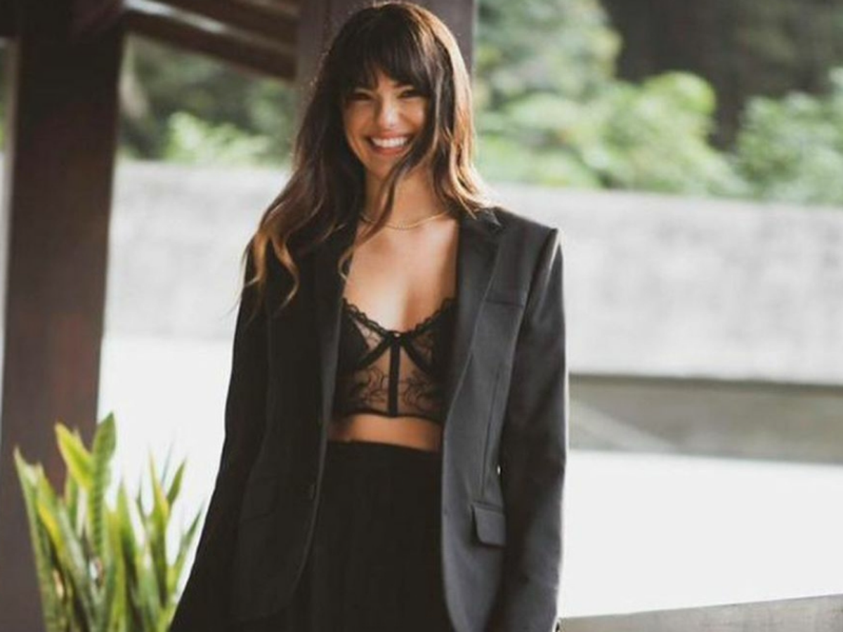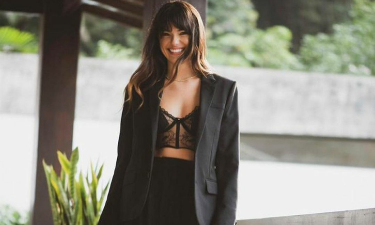 Nos cliques, a atriz exibe o ar sensual do bralet, também conhecido como bustiê, que é uma mistura de sutiã com corset. Estava de terninho preto, com blazer aberto.