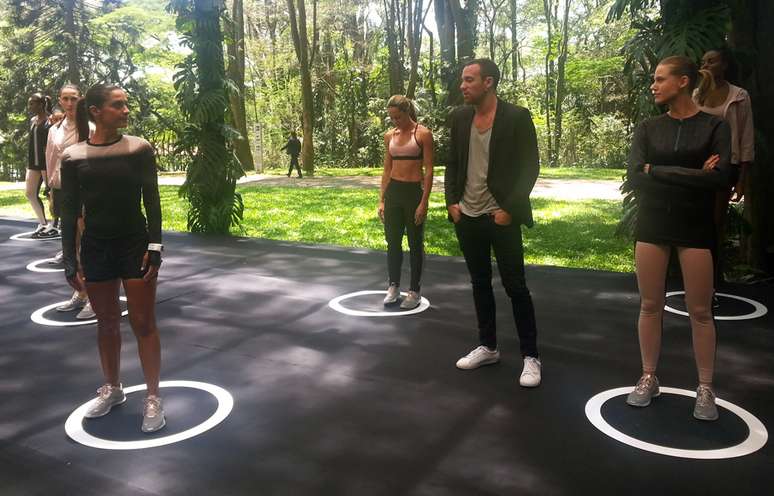 Algumas atletas, modelos e amigas do estilista usavam na atividade a nova coleção da Nike e Pedro Lourenço, feita inteira em preto e nude. “Quis integrar a roupa ao corpo, pelo uso direcional das duas cores”, explica o estilista de 23 anos. “Reproduzi peças icônicas adaptadas para o treino”, disse sobre a coleção, que utiliza o croco e listras pretas, característicos de suas criações. Ele também teve o desafio de deixar as roupas superleves e confortáveis, funcionando como uma segunda pele.