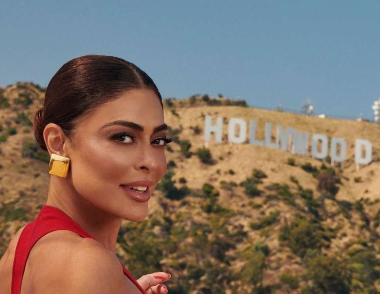 Para a famosa imagem que tem como fundo a palavra Hollywood nas montanhas de Los Angeles, Juliana apostou num vestido tipo regata da mesma cor da grife YSL.