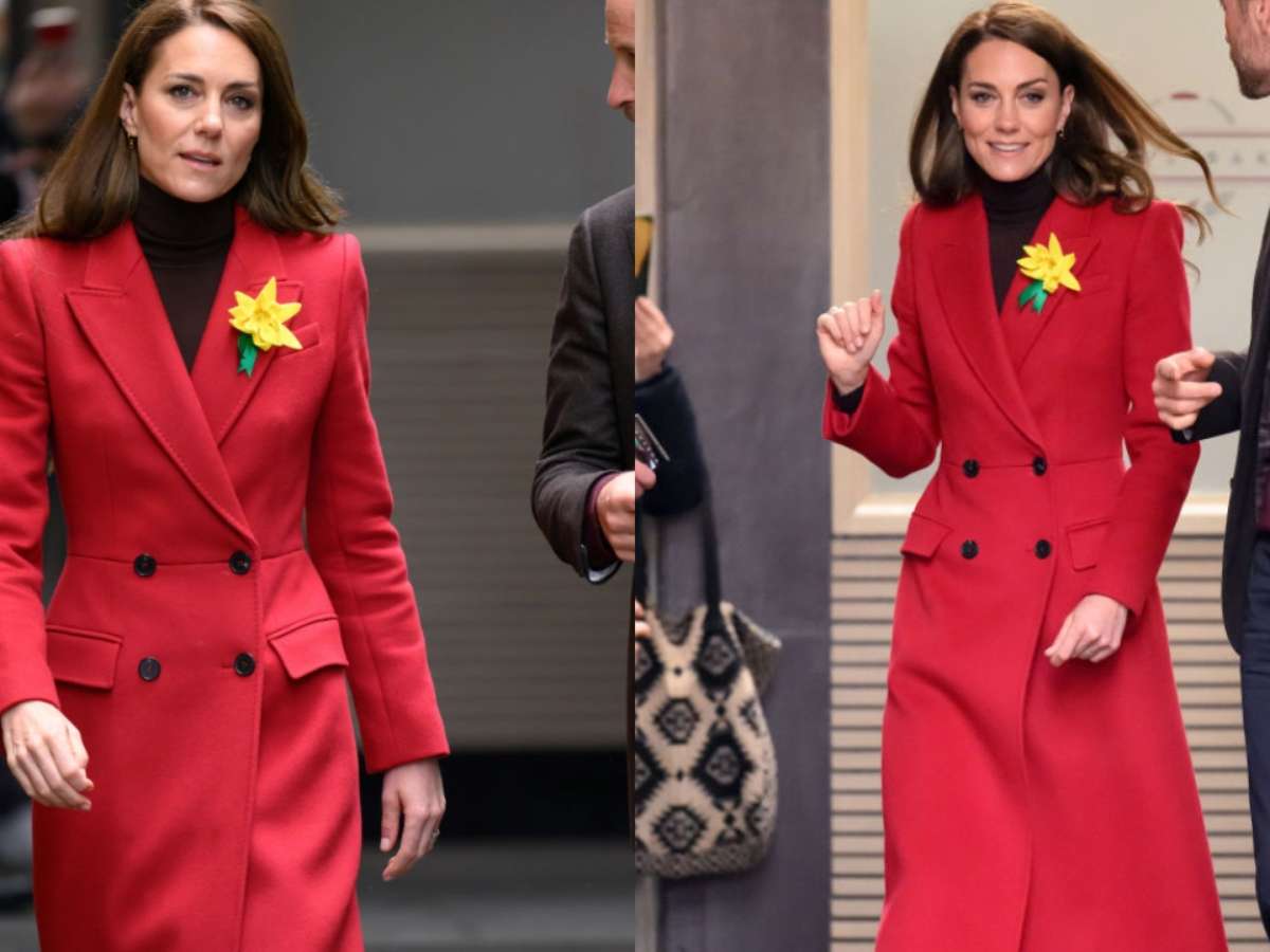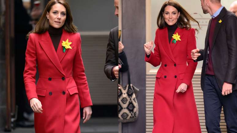 Na terça-feira, 26 de fevereiro, Kate Middleton foi vista com um trench coat vermelho combinado a um suéter marrom durante uma visita ao País de Gales, onde acompanhou o Príncipe William em uma atividade especial. A princesa adornou seu visual com uma flor narciso amarela, representativa da cultura galês.