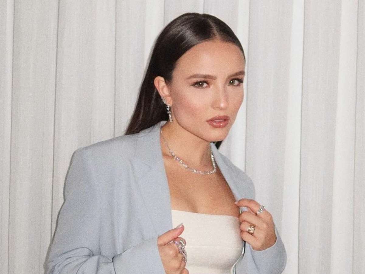 Larissa deixou os cabelos soltos, com risca central e parte das mechas atrás das orelhas. A maquiagem leve trouxe sombra marrom nas pálpebras superiores, cílios destacados e batom marrom-claro com leve brilho, reforçando o ar natural e elegante.