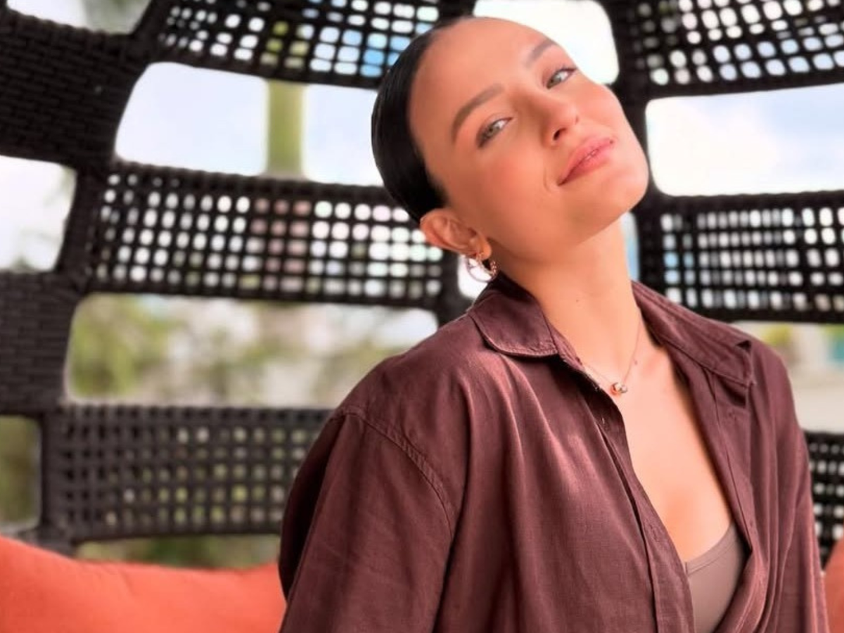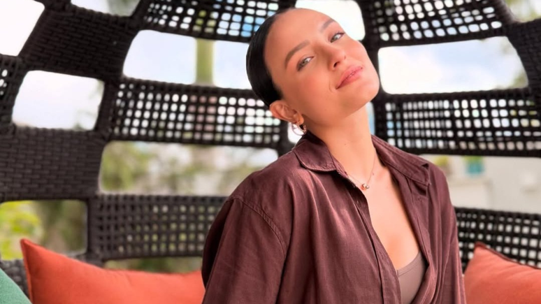 A atriz escolheu a proposta de tom sobre tom, que consiste em unir peças de diferentes tonalidades da mesma cor. Vestiu camisa com alguns botões abertos, revelando top por baixo, e calça legging.