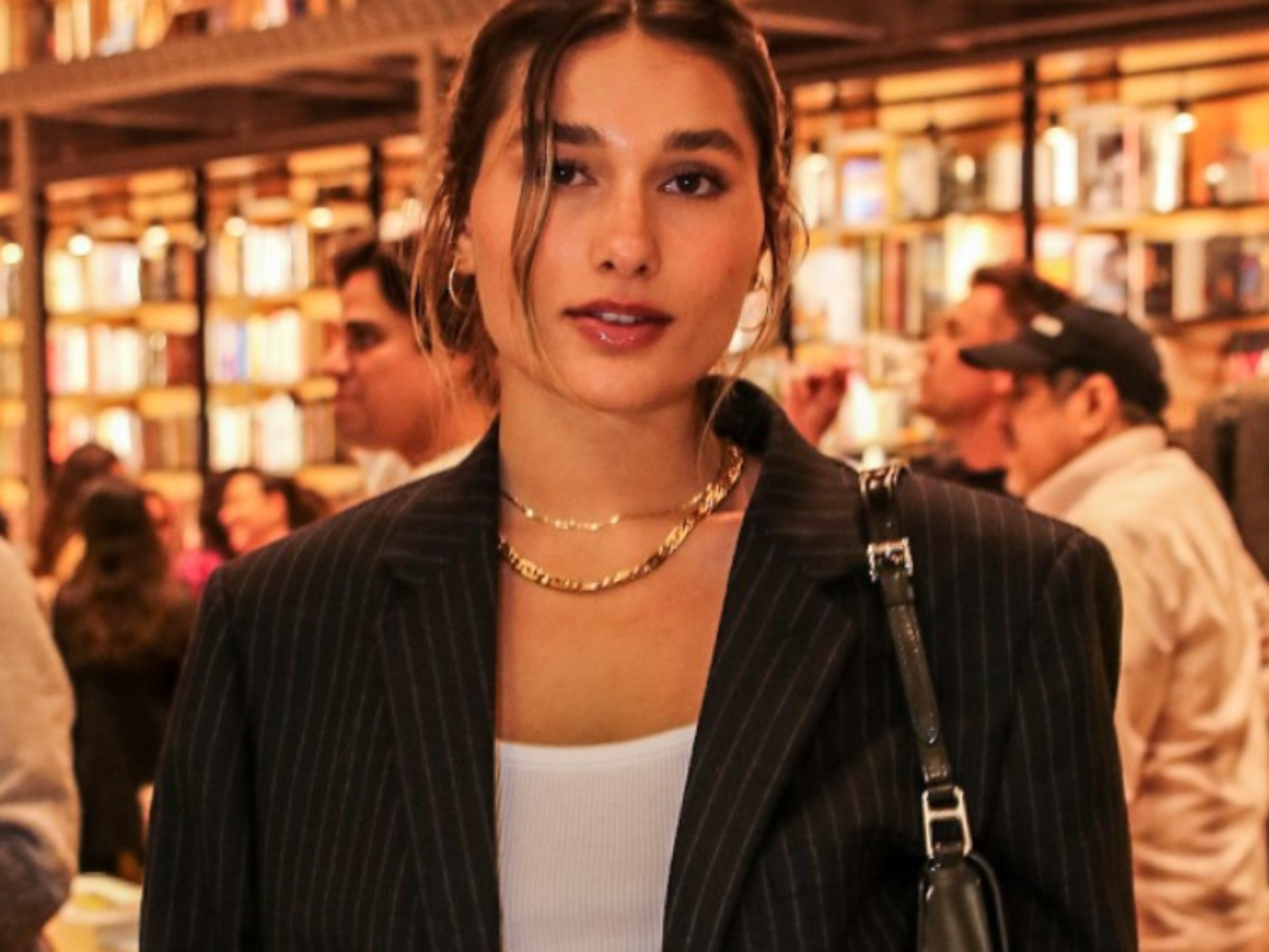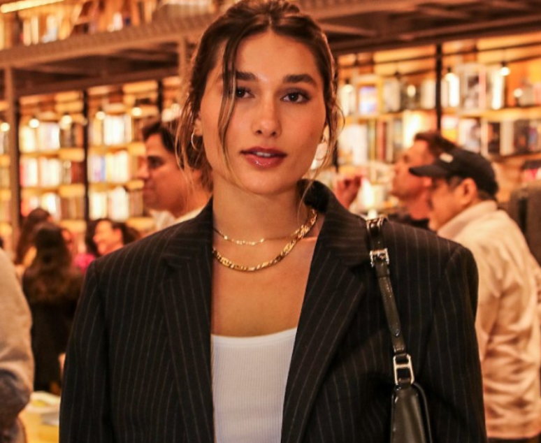 Para prestigiar Carol Trentini, Sasha usou o blazer risca de giz com camiseta branca, calça jeans, calçado Prada e bolsa preta pequena. Completou com correntes douradas.