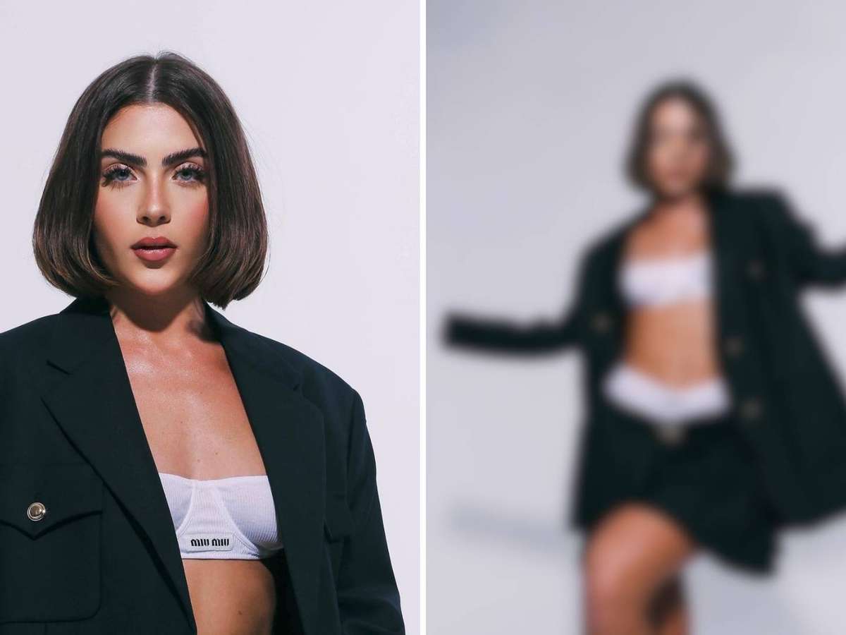 Apostando em produção luxuosa, a influenciadora surgiu com conjunto de lingerie de boxer e sutiã estilo top em branco que foi sobreposto com minissaia em cintura baixa e blazer oversized em preto. A produção foi finalizada com sandálias que misturam o clássico do salto com o conforto dos chinelos em um só calçado para lá de moderno.