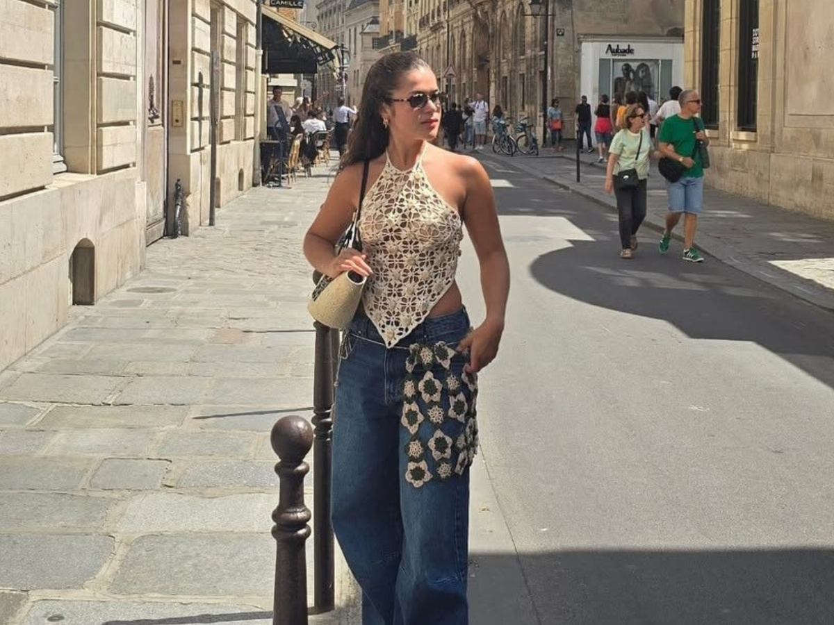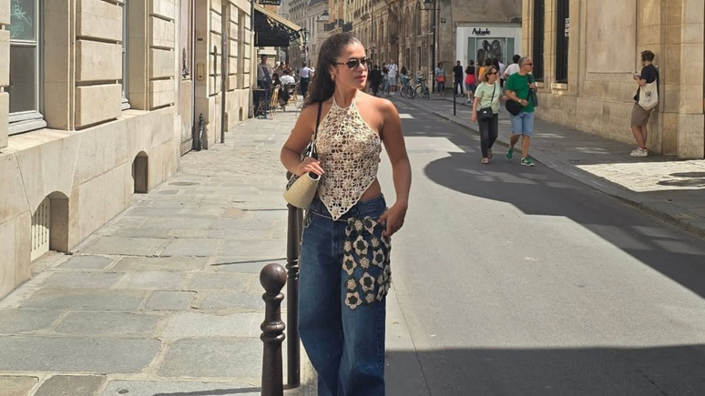 A atriz usou calça jeans de lavagem média e cintura baixa. O diferencial foi acrescentar por cima uma saia de crochê composta por flores em verde e creme, da Nymma, que está à venda no site da marca por R$ 299.