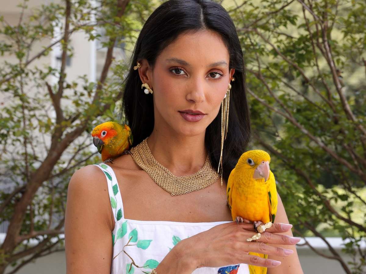 A joalheria, projeto mais recente da Thayná Caiçara, também integra o desfile. Produzidas na Bélgica, as peças incluem broches, colares, braceletes e anéis em ouro branco, amarelo e rosé, com diamantes, turmalina Paraíba, rubi e peridoto, dialogando diretamente com a coleção.