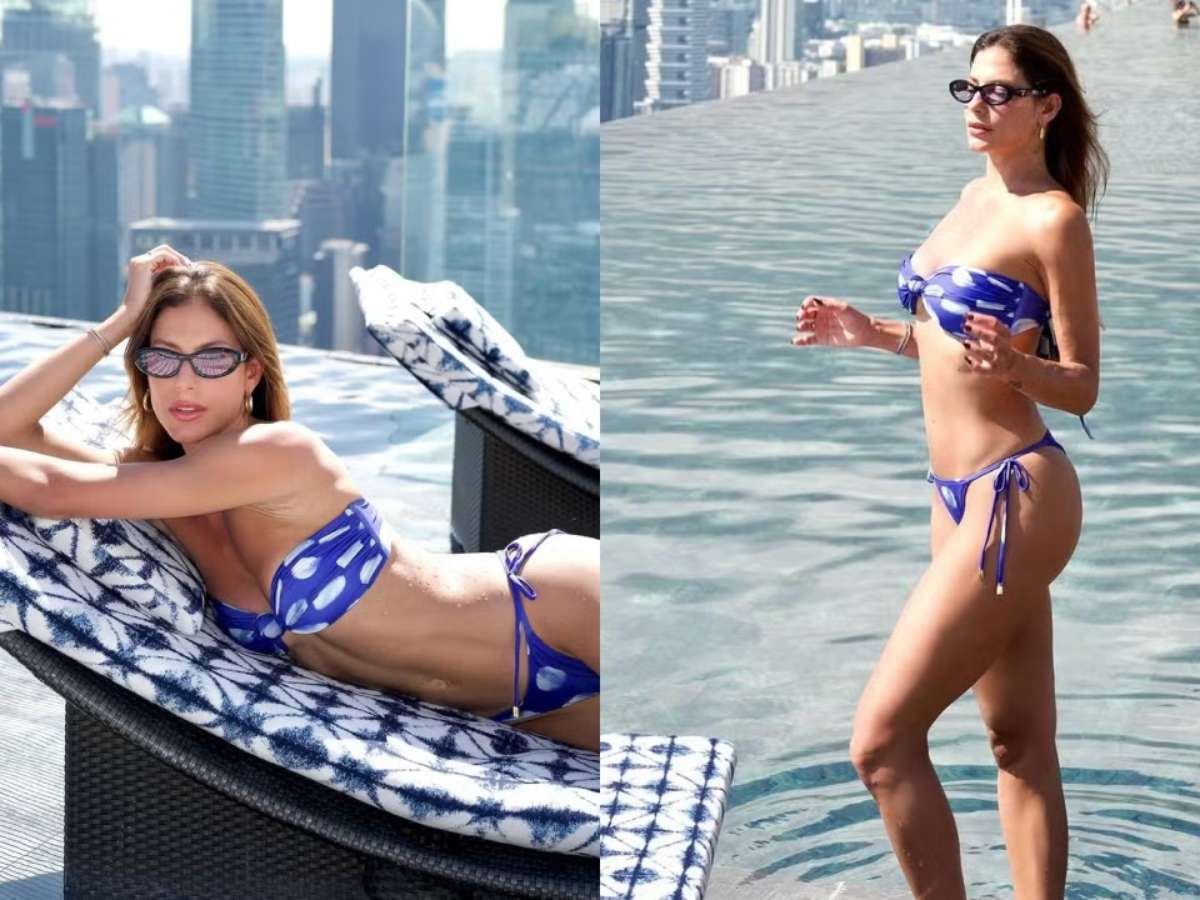 Mari Gonzalez aposta em beachwear estampada para curtir piscina luxuosa em Singapura