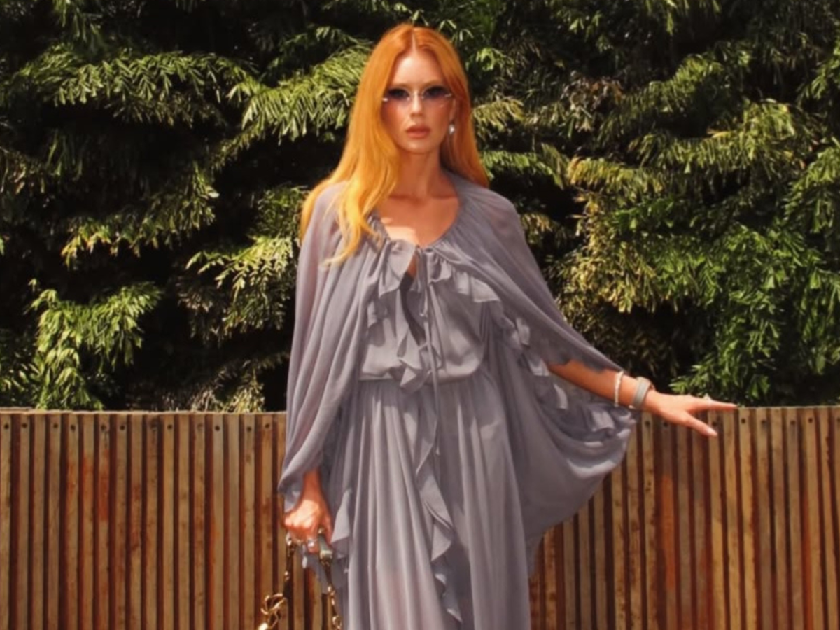 Para batizado na Capela do Cristo Redentor, Marina Ruy Barbosa apostou em vestido longo cinza. A peça conta com mangas amplas e aplicação de babados, no estilo boho chic. É da nova coleção da marca dela, a Ginger, que ainda não está à venda no site.