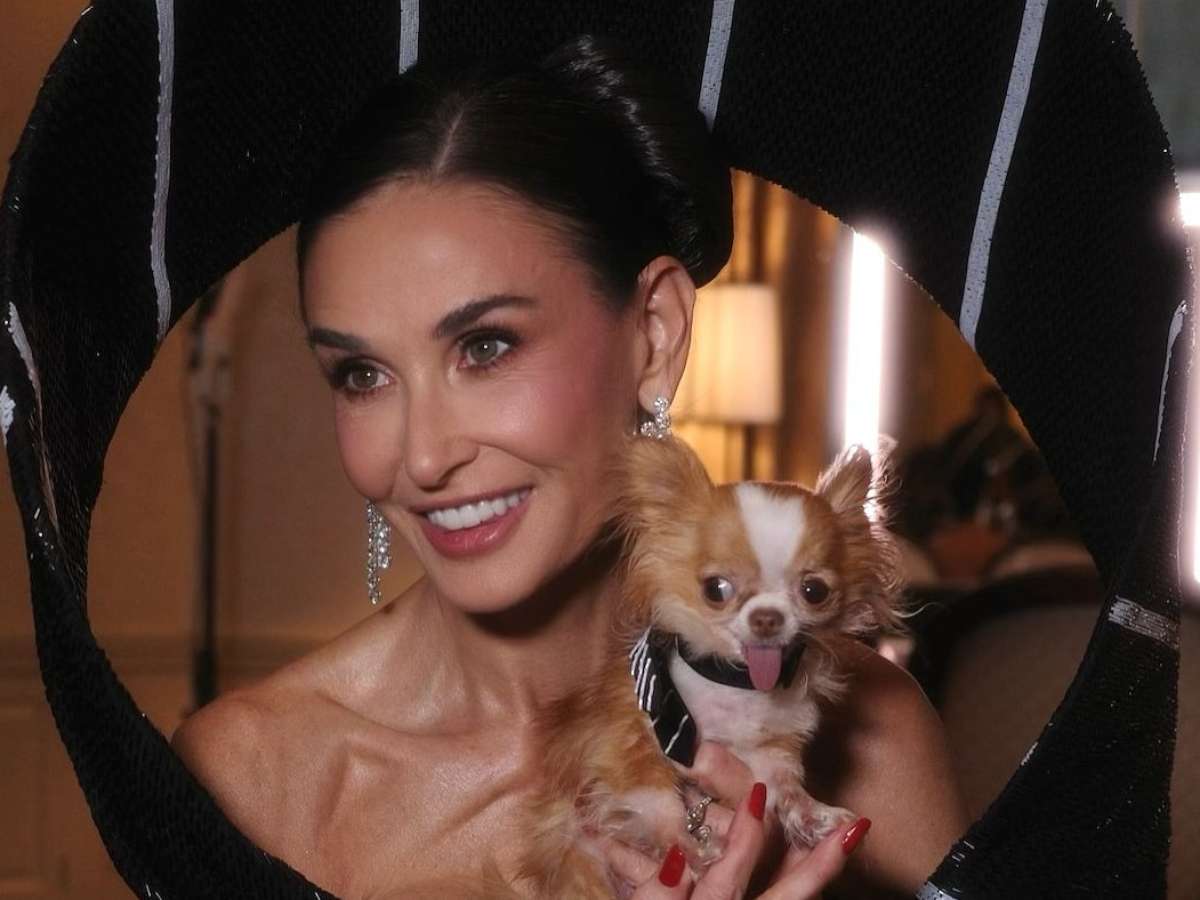 Met Gala: Demi Moore se veste de gravata e dog usa acessório igual