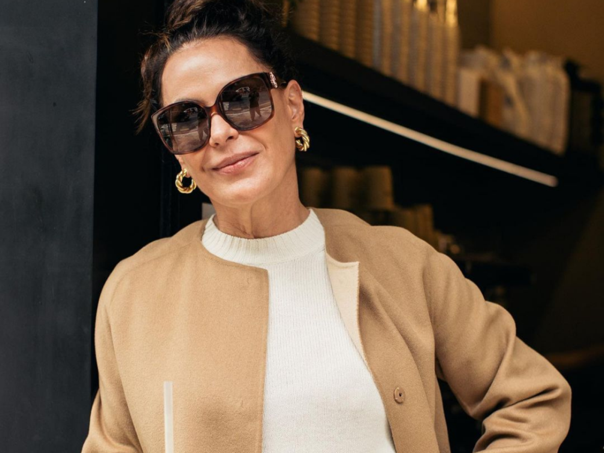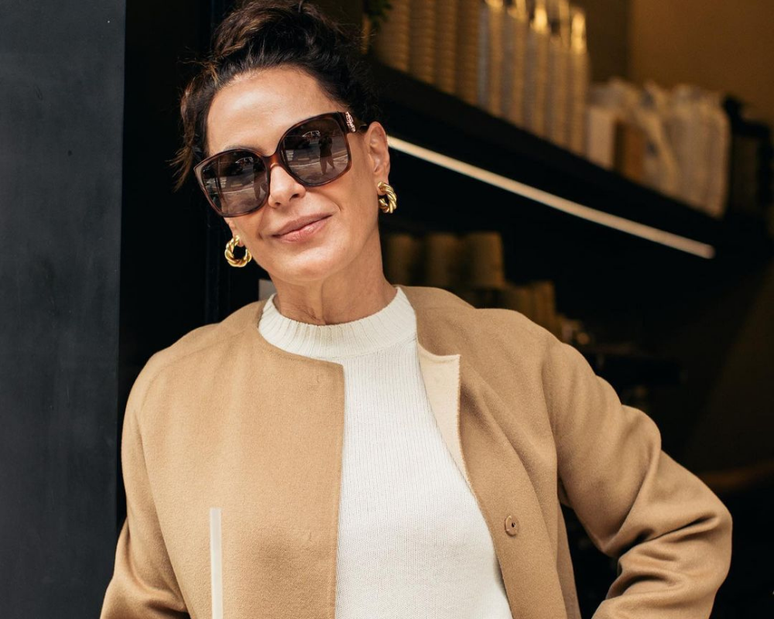 Minimalista, Carolina Ferraz mistura tênis branco e casaco