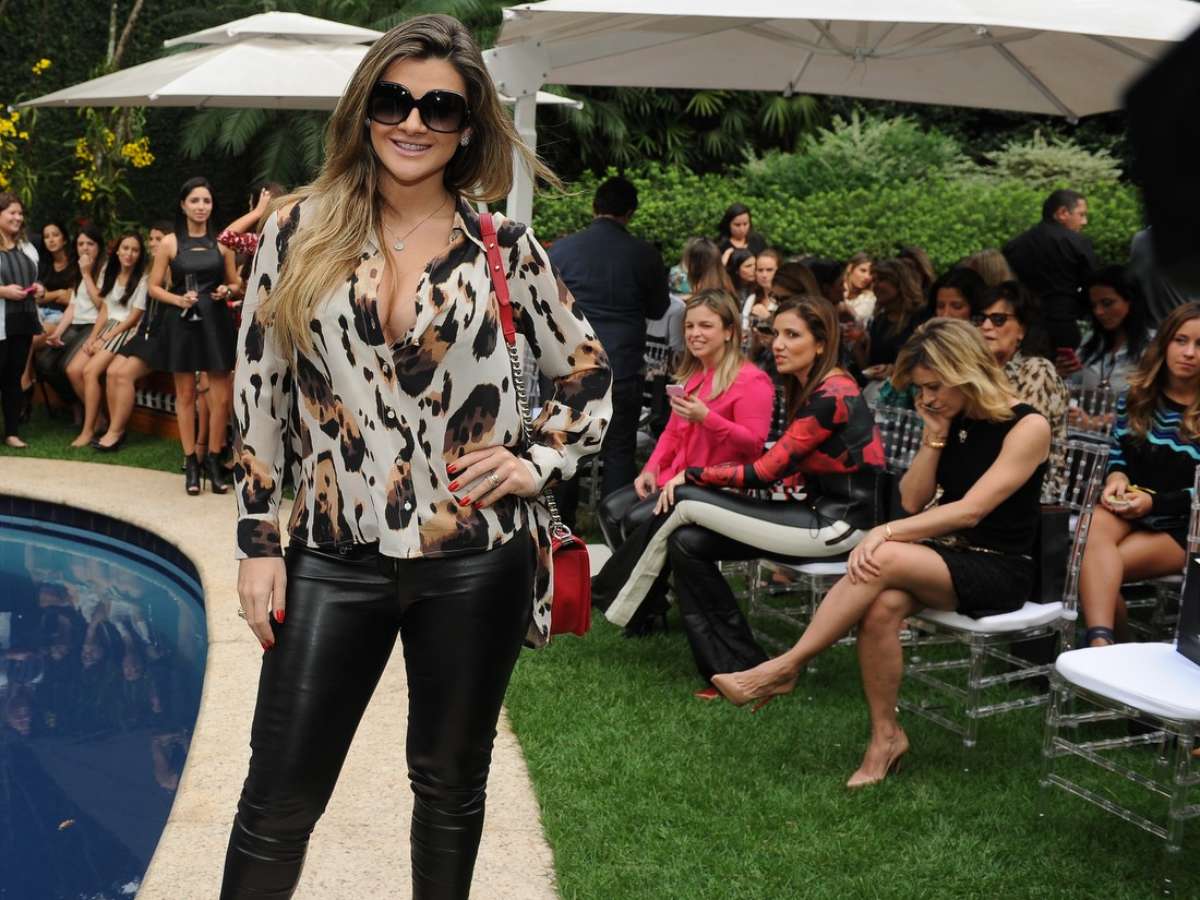 Para o evento, Mirella, que está no início da gravidez, usou camisa em animal print, que deixou o sutiã também com estampa de bicho à mostra, calça de couro preta e escarpins também pretos, com efeito brilhante.