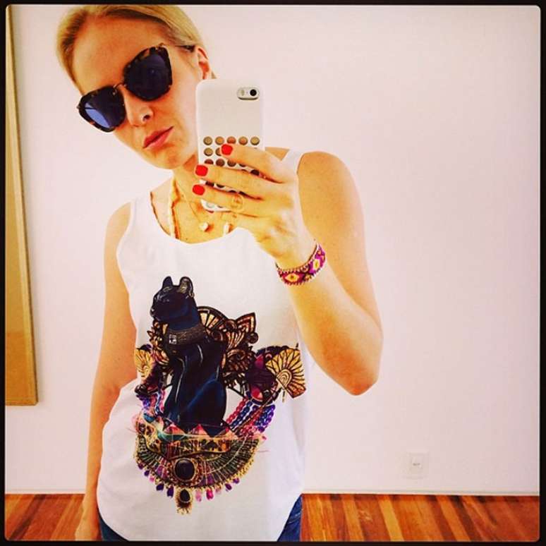 Angélica resolveu mostrar o look do dia para fãs nessa sexta-feira (13). A apresentadora posou usando jeans, regata com estampa e cabelo preso. Para completar, ela investiu em acessórios como óculos com armação de animal print, pulseira colorido e colares. "Fazendo a blogueira", escreveu ela na legenda