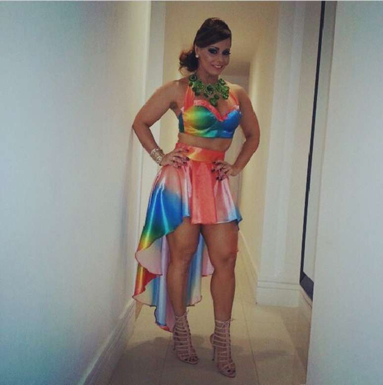 Não dá para saber aonde ela ia com essa roupa. Mas fosse onde fosse, mesmo um concurso de fantasia, a saia mullet e o top multicolor não ficou bem na moça nem ficaria em qualquer pessoa do mundo. Vamos esquecer, combinado?