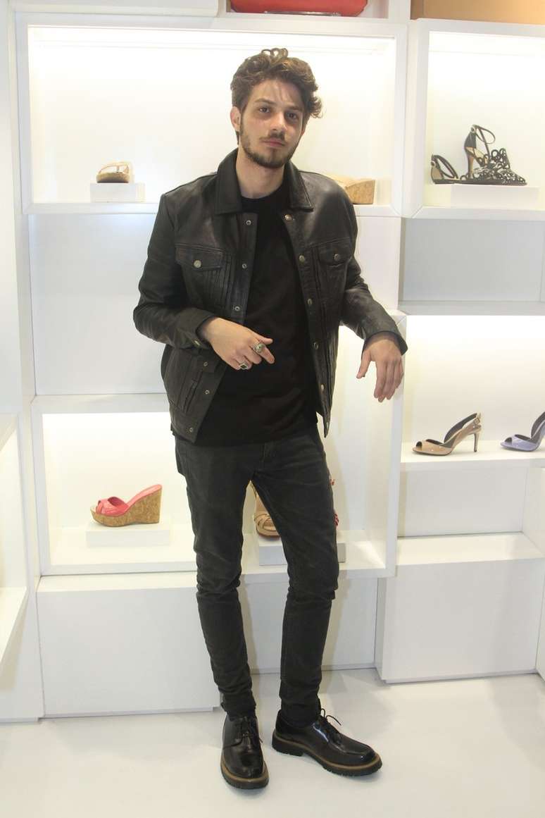 Chay Suede optou por um look roqueiro, mas básico, todo black e liso, para lançamento da nova coleção da Schutz