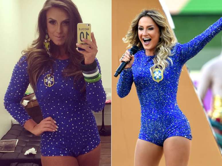Claudia Leitte usou um body azul da grife Água de Coco na abertura da Copa do Mundo. Aproveitando a torcida para a Seleção, Nicole Bahls apostou em uma roupa bem parecida com o da cantora e publicou foto no Instagram no domingo (6). "Vai começar Panico na Band ao vivo..apaixonada pelo meu macaquinho by @paulinho_h", escreveu ela
