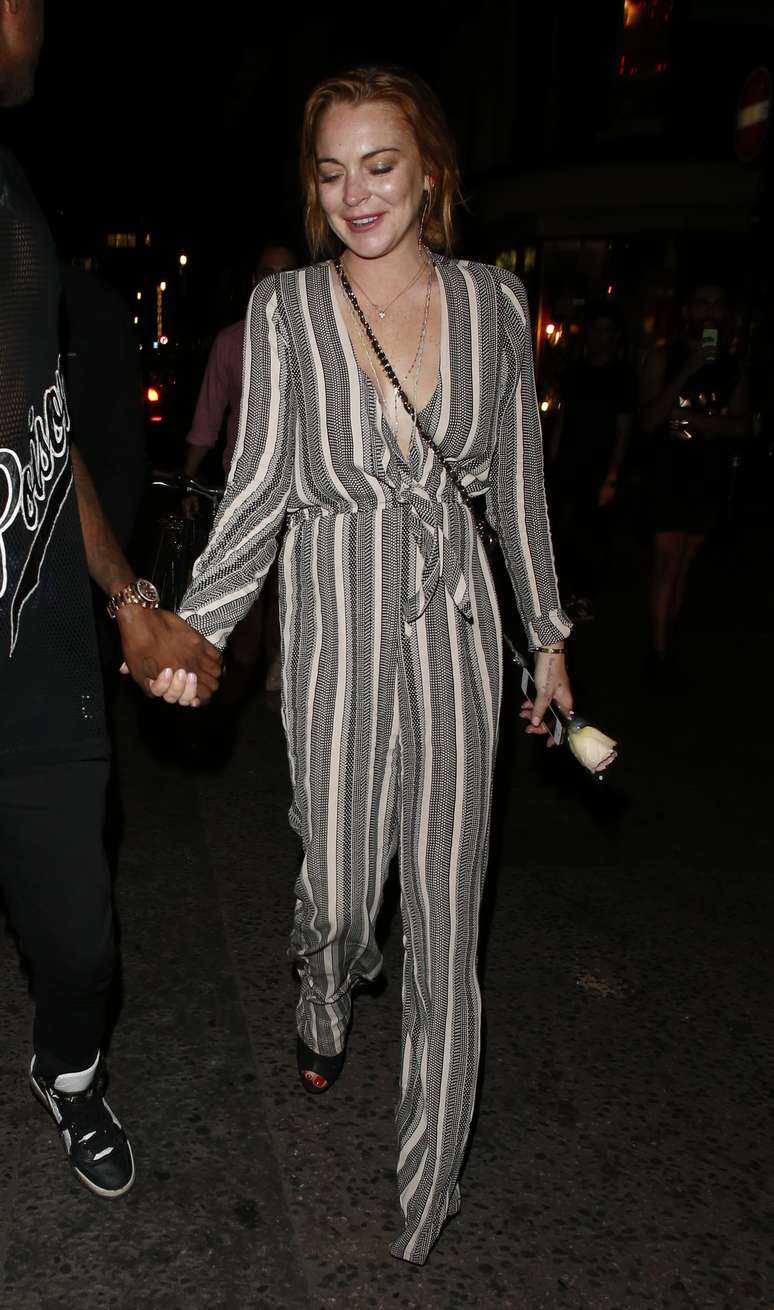 A atriz Lindsay Lohan usa um macacão bicolor legal, com listras verticais mais puxadas para o cinza, que alongam. A peça, porém, está comprida e decotada demais. Se tivesse acertado nestes detalhes, teria ficado ótima.