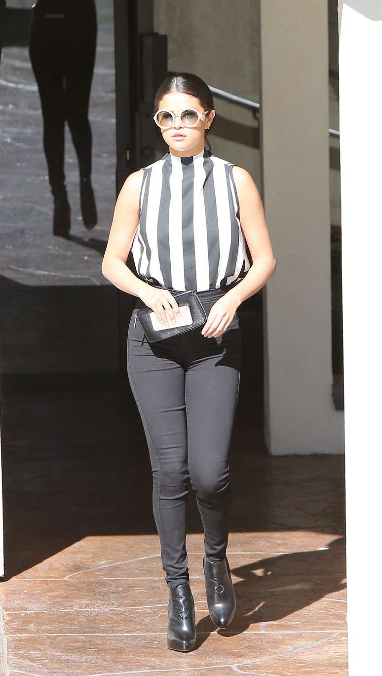 Selena Gomez usa blusa com listras em preto e branco largas, que ficou em alta no ano passado. Ficou legal nela, mas a calça tão justa e de cintura alta não foi uma das melhores escolhas. Quem tem o quadril avantajado deve evitar copiar o look.