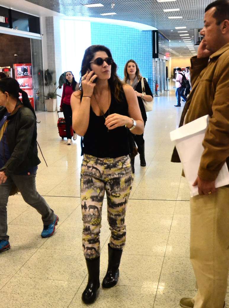 O look de Priscila Fantin é predominantemente preto e branco, com detalhes amarelos na estampa da calça. A bota tipo galocha é um recurso despojado para usar com a peça estampada e a regata preta, mas não é aconselhável a quem tem pernas grossas e curtas. Como não é o caso dela, ficou legal.