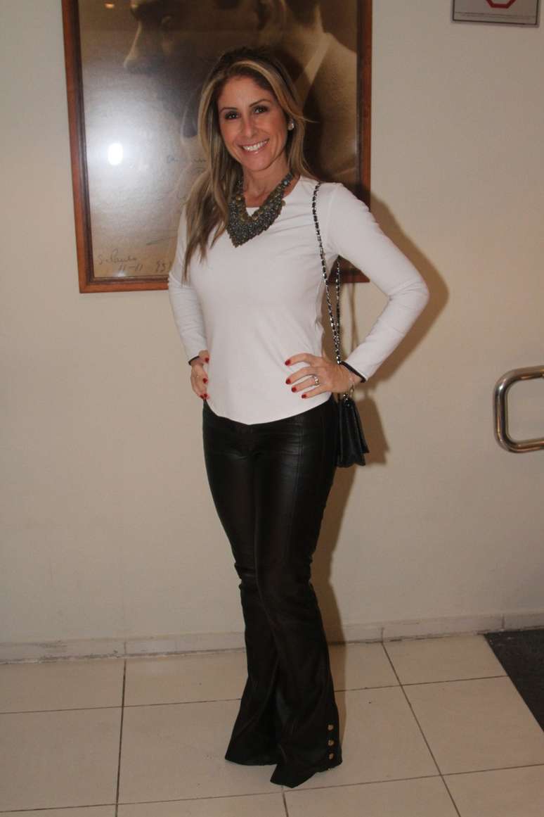 A apresentadora Patricia Maldonado também apostou na combinação calça preta e blusa básica branca. O maxicolar caiu bem no look, mas a calça tipo flare (com a barra mais larga) deveria estar um pouquinho mais curta, para não parecer que ela está sobre um pedestal.