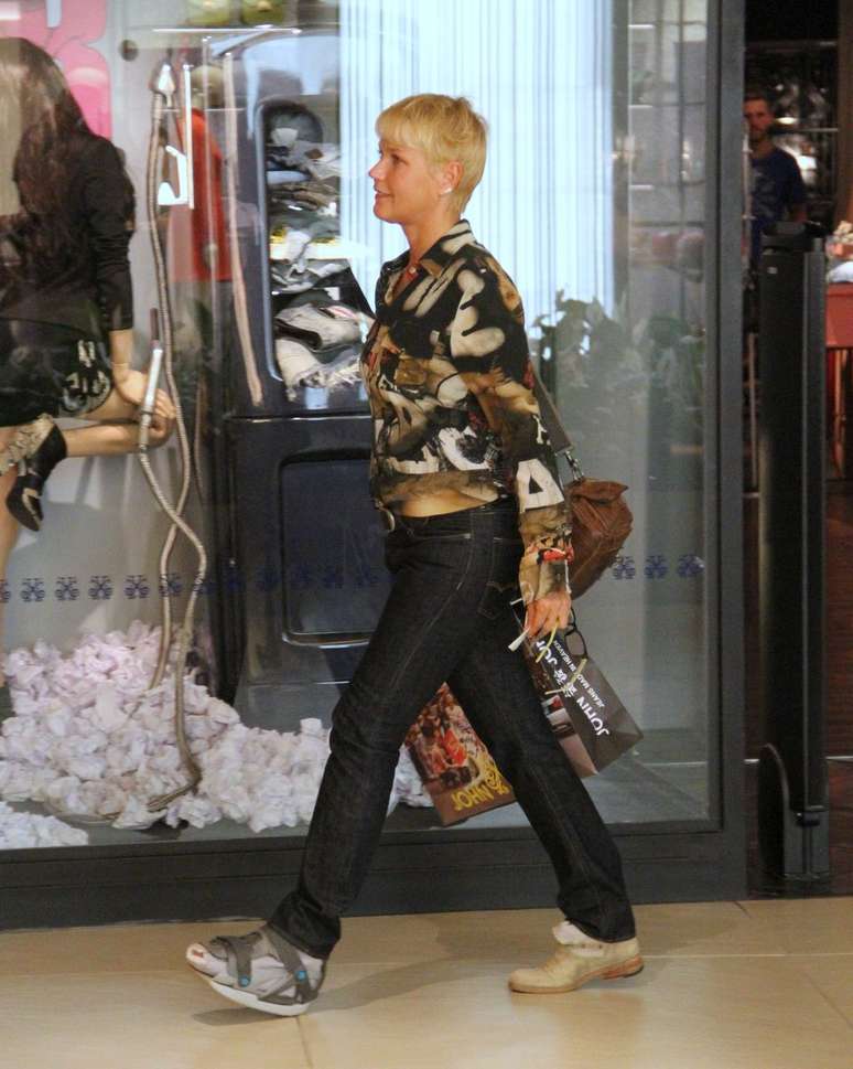 A Xuxa, que ainda tem de usar a bota ortopédica por causa do problema no pé, foi ao shopping com calça jeans e camisa camuflada. A combinação é ótima para esse tipo de passeio e ideal para qualquer idade. Ótima opção, Xuxa.