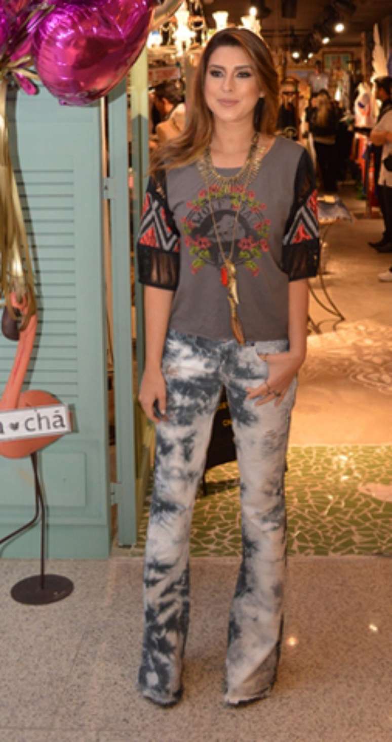 Fernanda Paes Leme aposta num look jovem e que funciona. A calça jeans flare (boca mais larguinha) é ótima para alongar a silhueta. E o manchado tye-die está em alta. Para completar camiseta com estampa na manga e na frente.