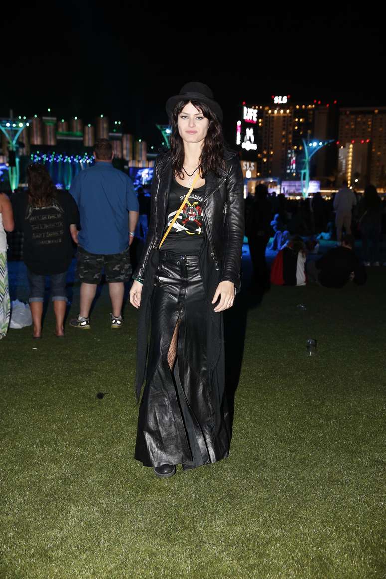 Nossa! A Isabeli Fontana está quase irreconhecível com esse look todo preto e rocker. É apenas para poucas usar meia, saia longa com fenda na frente, camiseta, jaqueta e chapéu. Nem nela ficou assim tão legal. Largada demais.