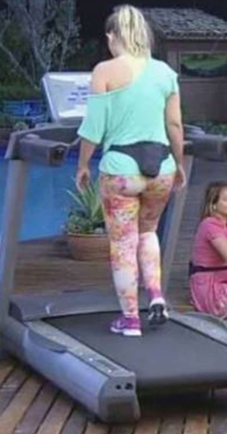 As leggings estampadas para fazer exercícios caíram no gosto da mulherada. Isso não significa que qualquer uma serve. Essa usada por Andrea Sorvetão não valoriza o corpo, pois a estampa que lembra manchas acabam realçando o que não devia.