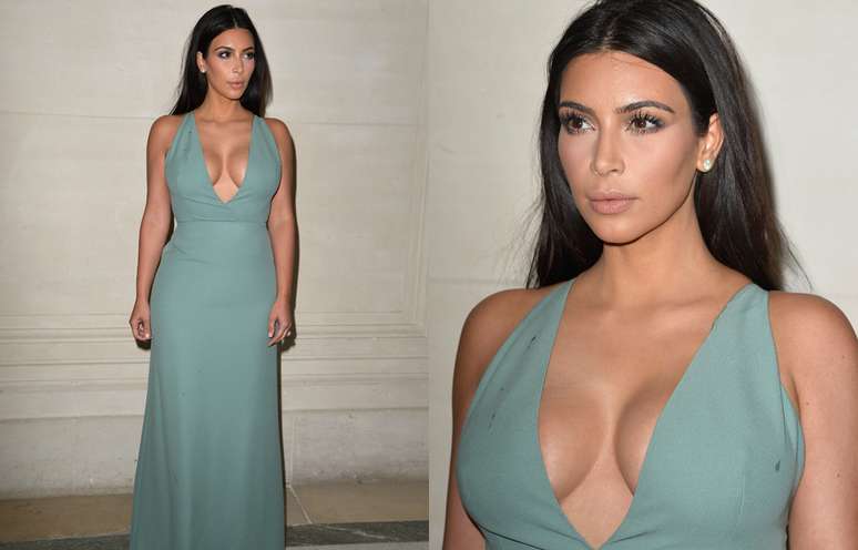 Pessoas normais e com bom senso não devem copiar o estilo inteiro de Kim Kardashian. No quesito decote, a coisa piora. O vestido em tom de azul-água é legal, mas o decote deixa quase explodir os seios, que mais parecem duas bolas, ou melhor, bolões. Esqueça.