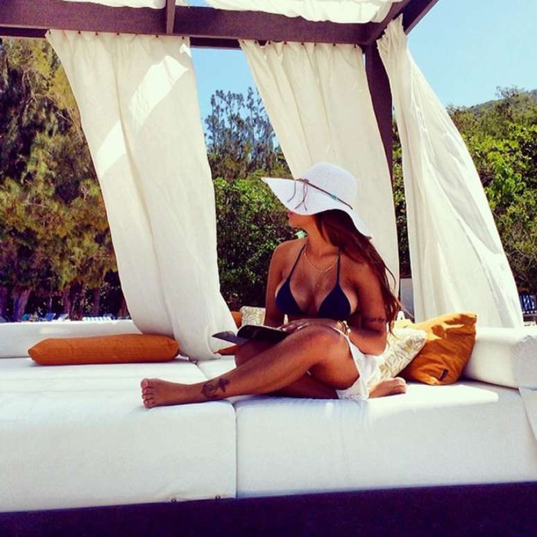 Durante férias em Labadee, no Haiti, Rafaella Santos publicou foto em que aparece usando biquíni de cortininha preto e chapéu branco para se proteger do sol. Para completar o look verão, correntinha delicada e pulseiras. "Aí vem a vida e te vira do avesso só para provar que a felicidade vem de dentro para fora", escreveu a irmã de Neymar na legenda da foto
