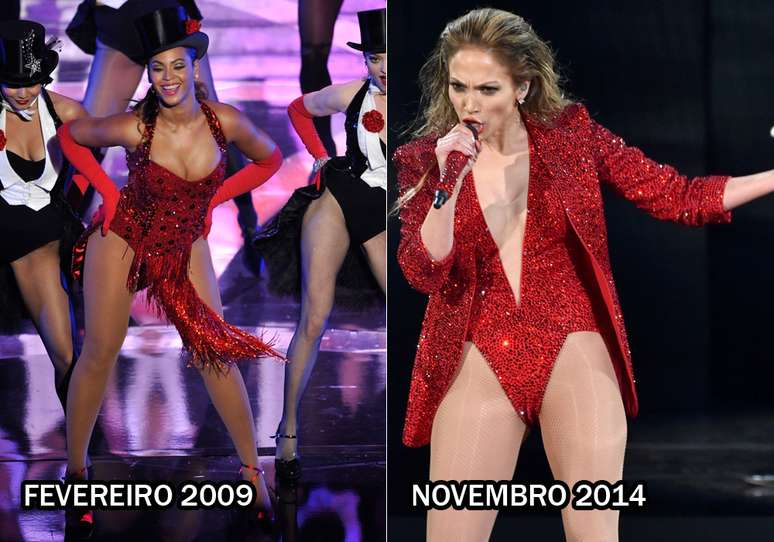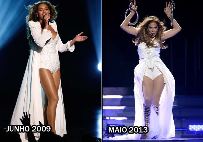 Beyoncé usou o body em um show no dia 31 de agosto de 2013. Jennifer Lopez apostou em top e hot pant em apresentação de 30 de maio do ano passado.