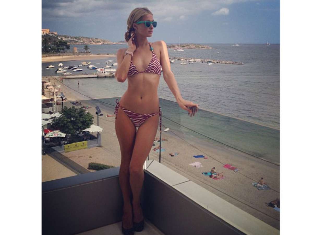 Paris Hilton publicou foto antes de curtir o sol em Ibiza nesta terça-feira (20). "Pronta para ir à praia com meu pequeno biquíni rosa de zebra", escreveu ela ao mostrar look verão, com biquíni de lacinho rosa e preto, óculos modelo wayfarer verde, coque baixo com trança e salto alto