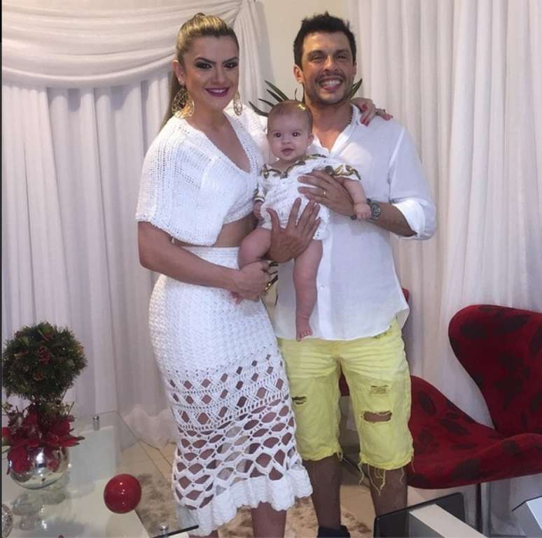 Ao lado do marido e da filha, Mirella Santos apostou no crochê, tendência número um do verão. A saia midi tinha detalhes vazados na barra e foi combinado com top cropped que deixava parte da barriga à mostra.