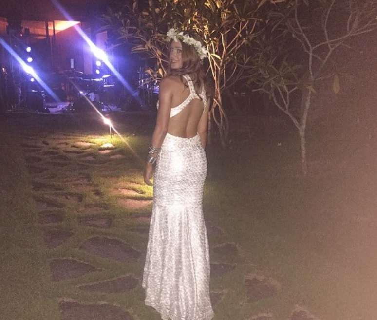 Marina Ruy Barbosa manteve a pose com um vestido longo elegante e perolado. Destaque para o caimento estilo sereia e decote nas costas.