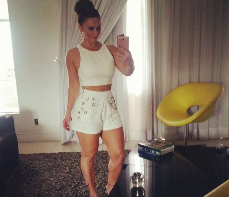 A atriz Viviane Araújo combinou top cropped branco com short bordado e sapatos dourados.
