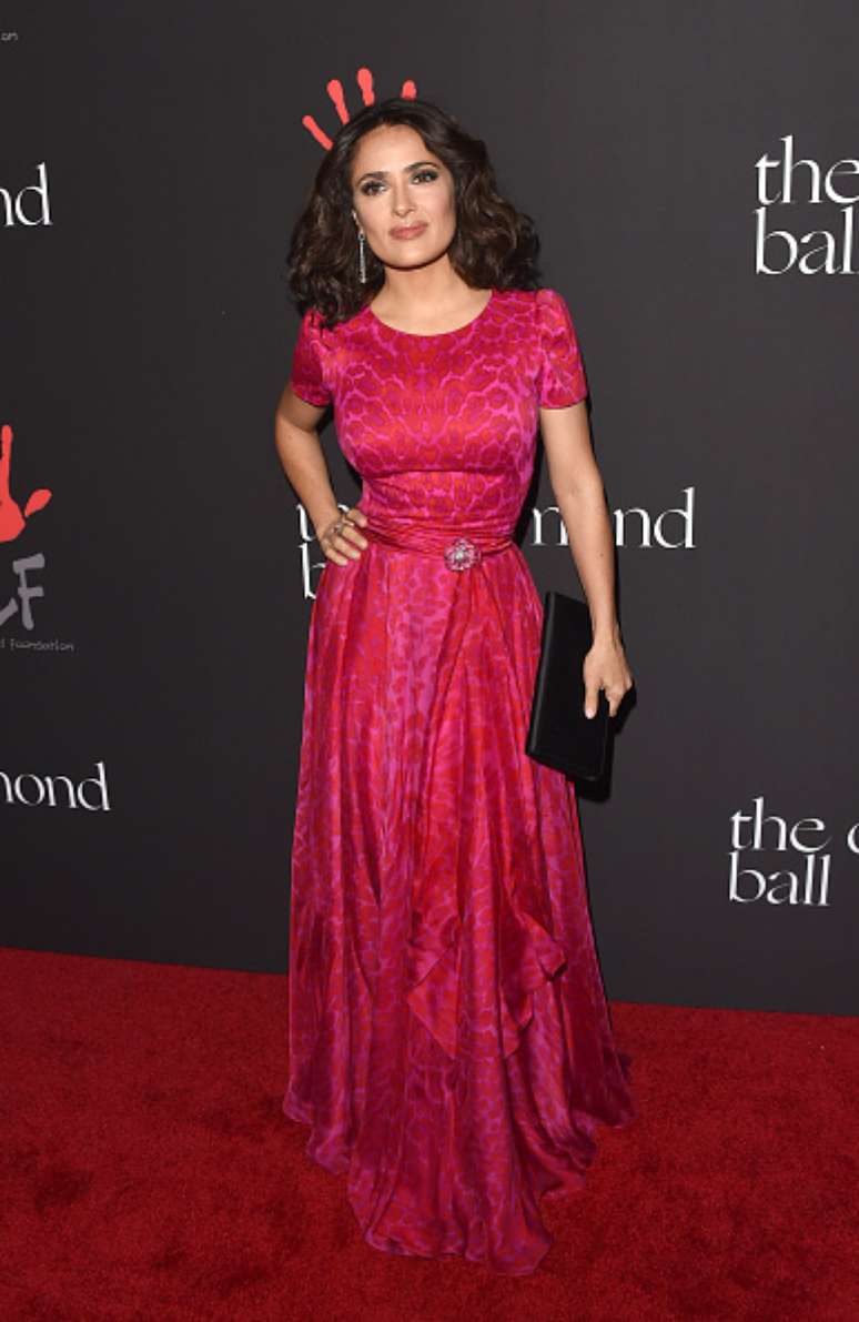 A atriz Salma Hayek posou com vestido longo estampado e com cintura marcada