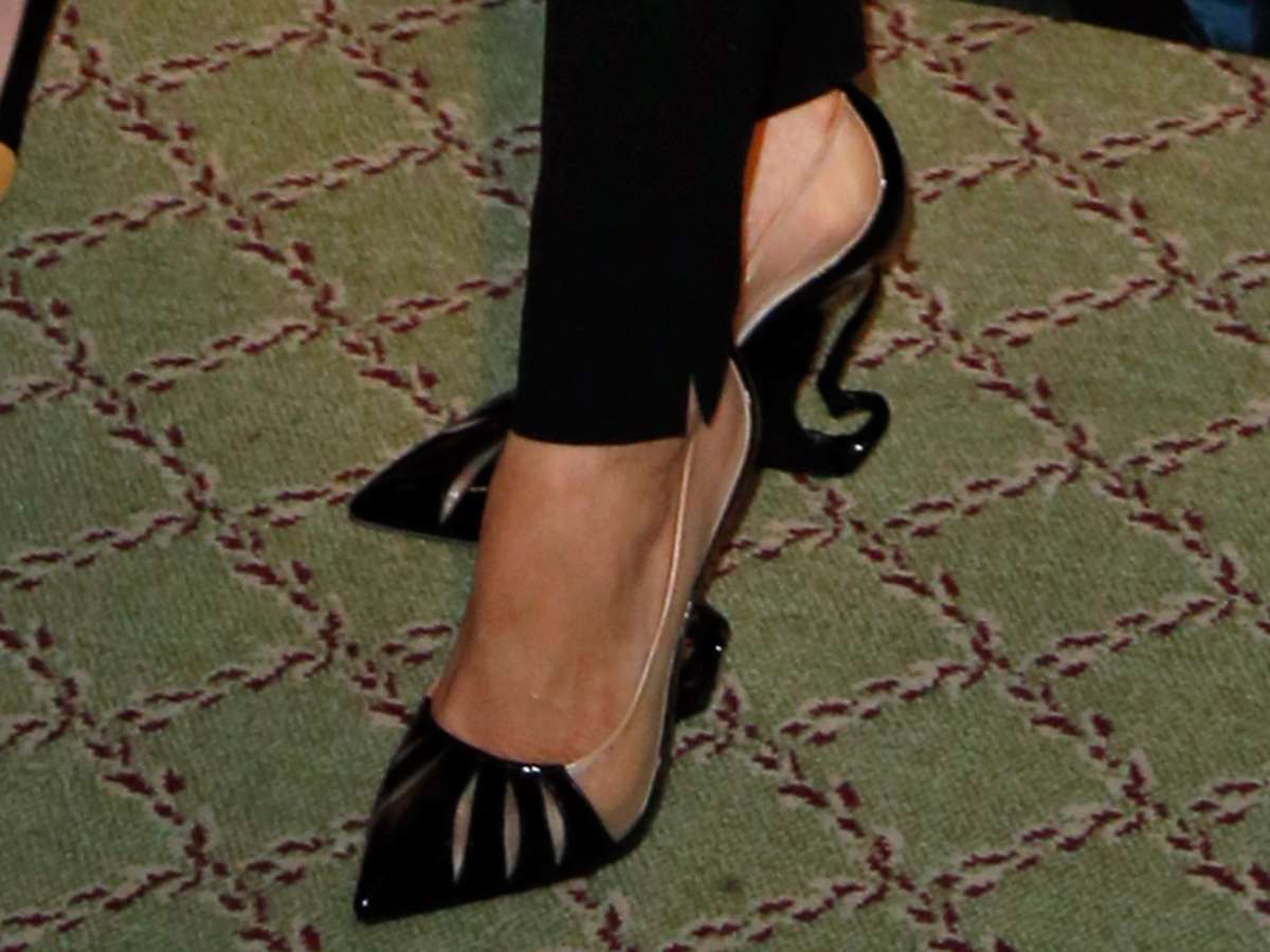 A atriz usou o salto para divulgar o filme 'Malévola', do qual é protagonista