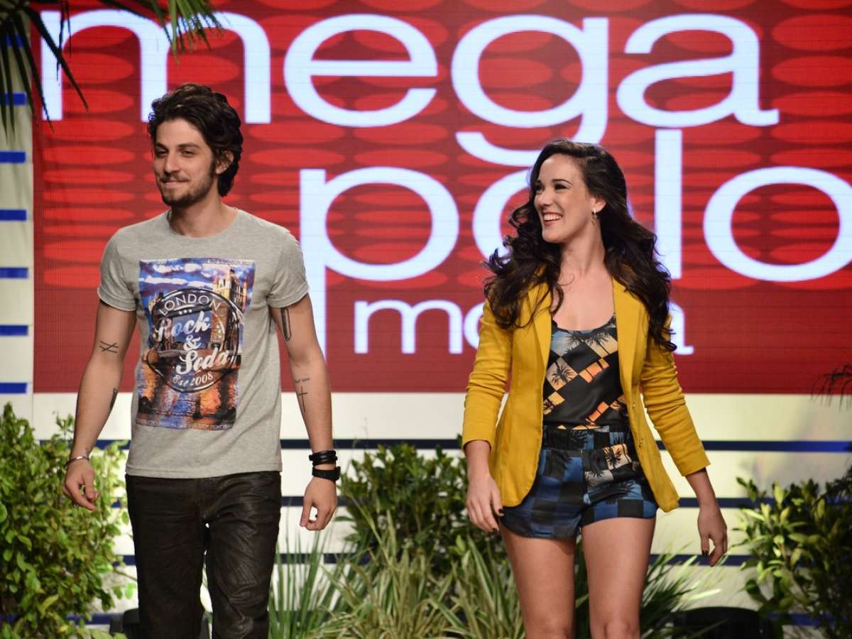 Chay Suede e Adriana Birolli desfilaram no Mega Polo Moda nesta terça-feira (29). Camiseta estampada e jeans e macaquinho com blazer foram os looks exibidos pelos atores na passarela