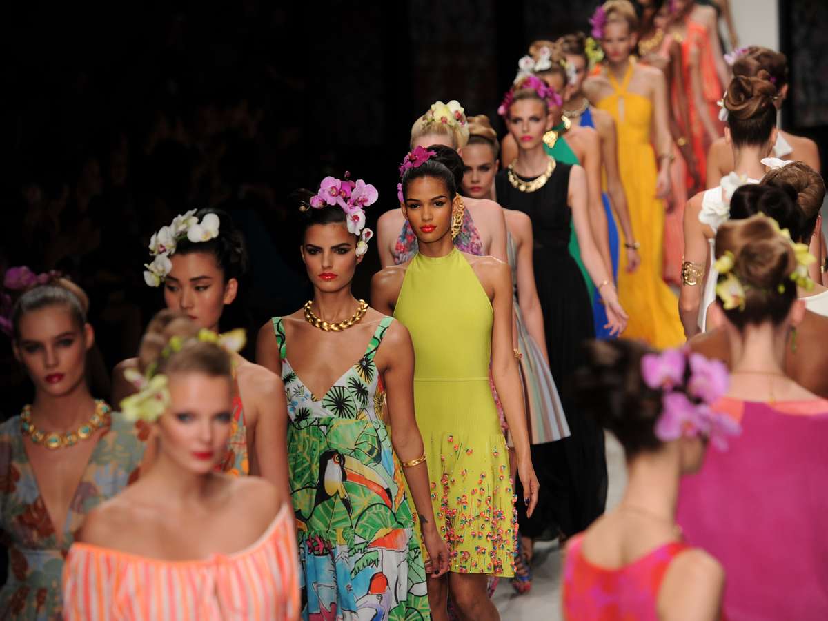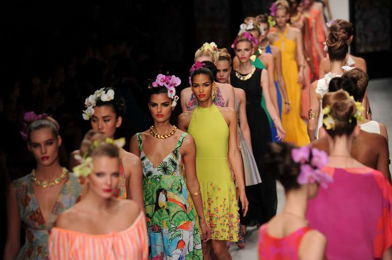 O tema da coleção recebeu o nome de Jardim do Éden. Por isso, não faltaram estampas florais e de aves típicas do Brasil nos vestidos longos de seda e jersey, uma das marcas da estilista que veste as irmãs Middleton e é uma das designers preferidas das jovens da alta sociedade britânica.
