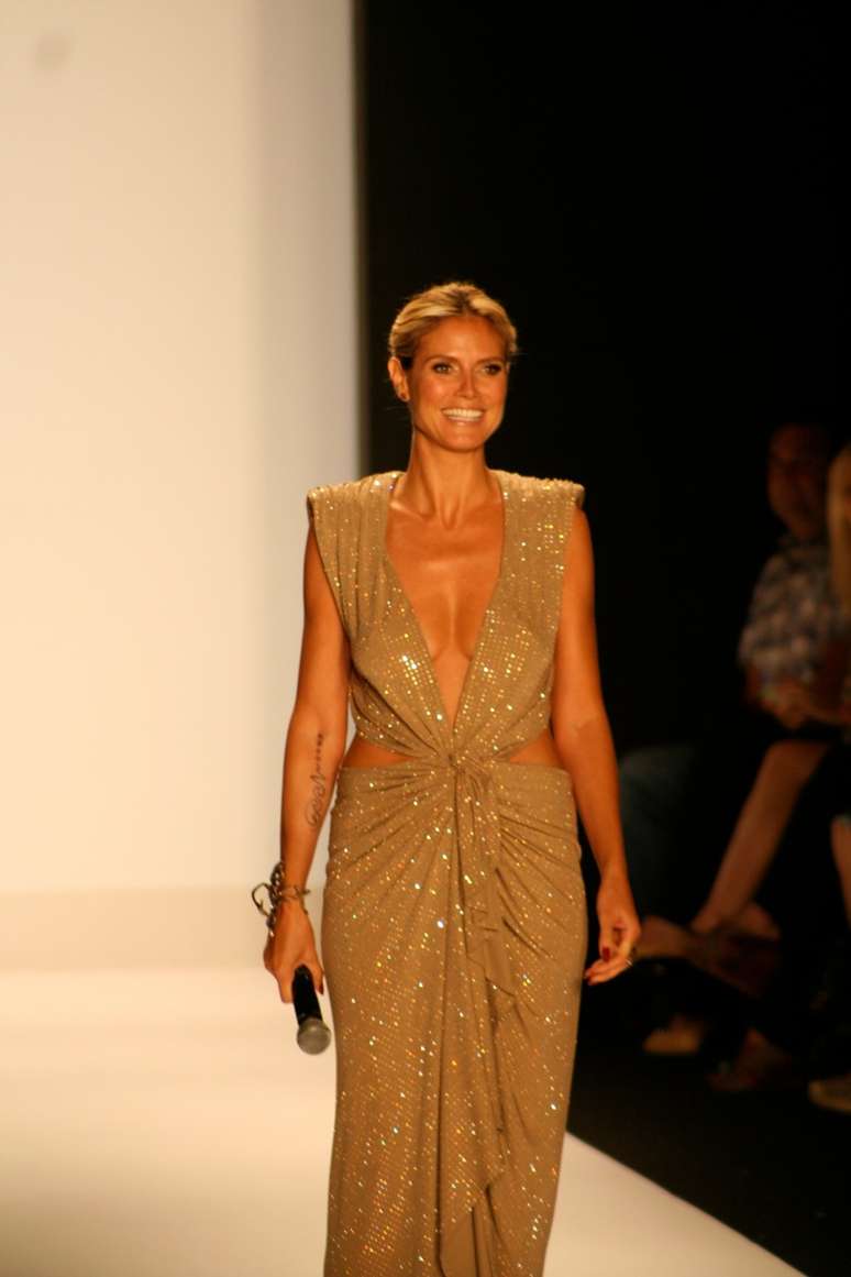 A top Heidi Klum, apresentadora do reality show fashion Project Runway, abriu a passarela de hoje (7) na Semana de Moda de Nova York. Com um vestido para lá de decotado, ela apresentou o desfile do Project Runway ao lado da cantora e atriz Jennifer Hudson, do estilista Michael Kors e da jornalista de moda Nina Garcia, no Lincoln Center.