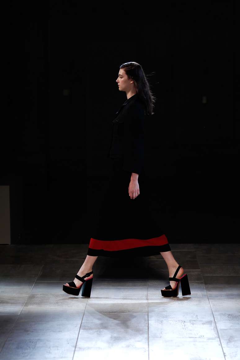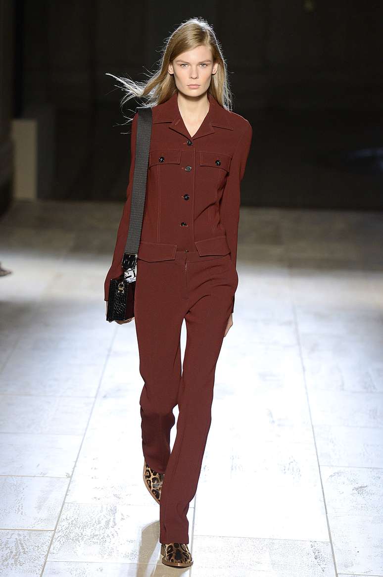 Na passarela, Victoria Beckham mostrou uma coleção levemente inspirada nos anos 1960 com looks monocromáticos em tons safari, preto e vermelho. Cintura marcada com cinto e bolsos grandes são alguns dos detalhes, ao lado de listrado preto e branco e estampado floral rosa.