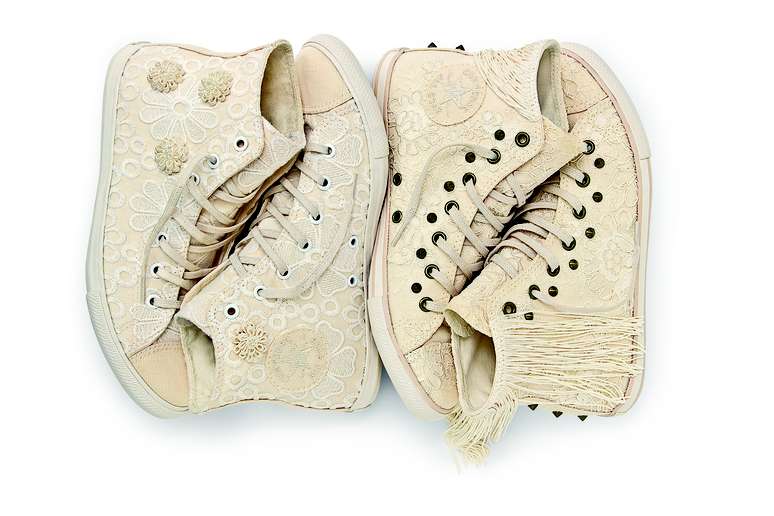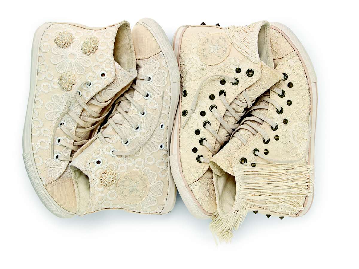 Os modelos misturam acessórios nobres, como metais, rendas e franjas francesas. Para as noivas mais românticas, o tênis é feito em lese, com aplicações de flores e pérolas. Já para as mulheres com estilo rock ‘n’ chique, o modelo conta com renda floral, spikes e franja na lateral.
