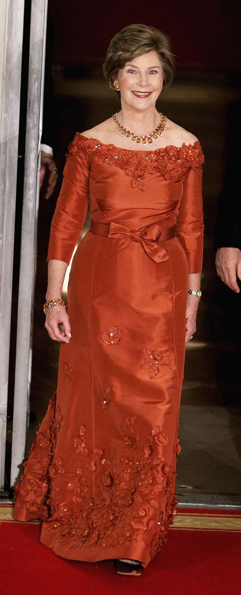Em 2005, a ex-primeira dama dos Estados Unidos Laura Bush exibiu vestido vermelho Oscar de La Renta.