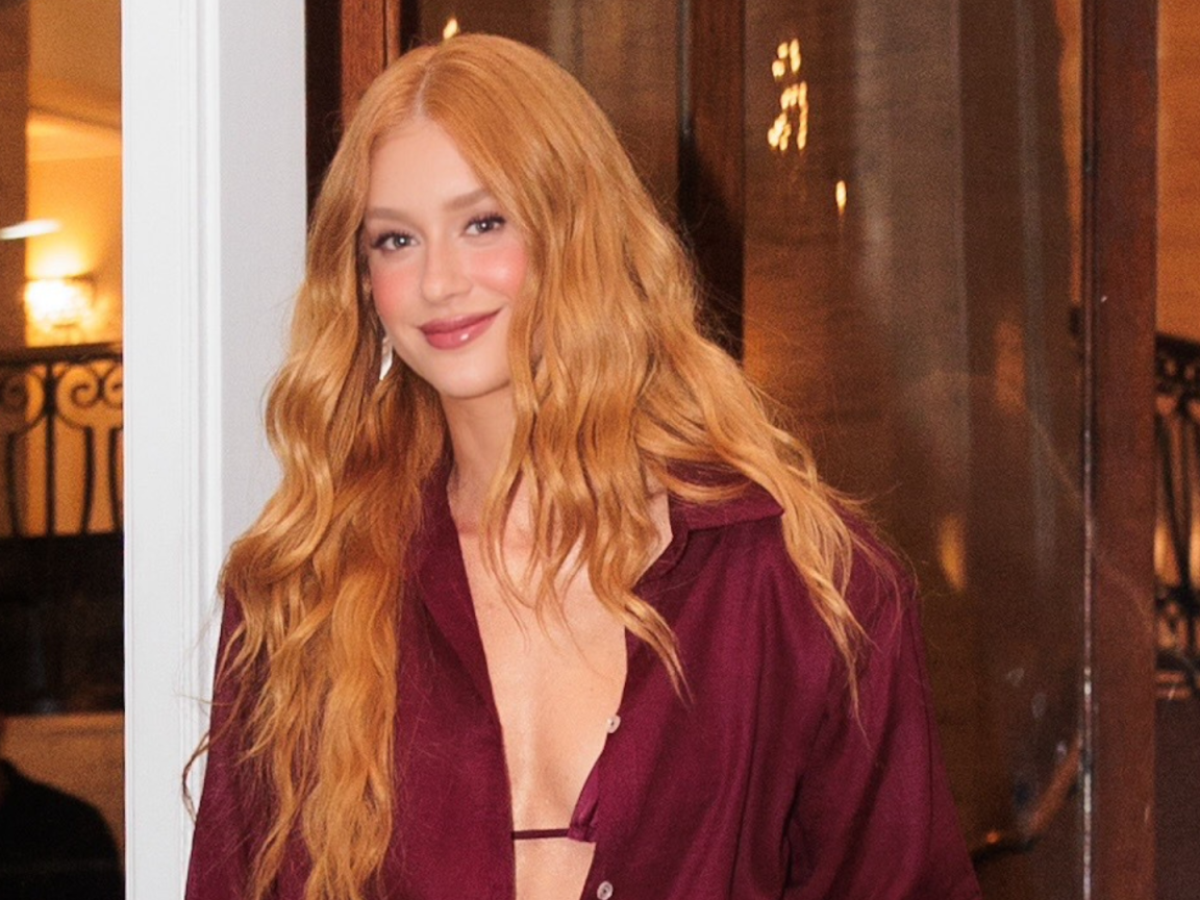 Se você não tem uma peça bordô ou burgundy pode ir providenciando. É a cor do momento. Marina Ruy Barbosa usa camisa com sobreposição de amarração.