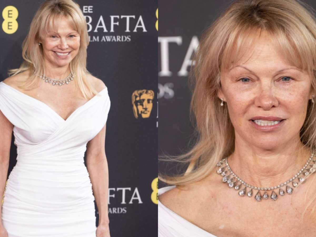 Pamela Anderson usa vestido all-white e diamantes feitos em laboratório para o BAFTA