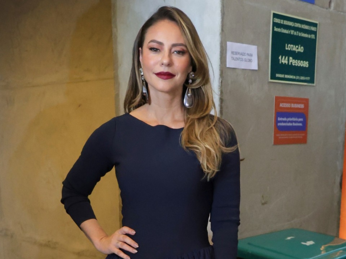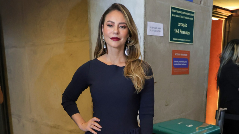 Grazi Massafera foi de camisa preta cropped (curta) com tiras cruzadas na barriga. Também estava com calça bege.